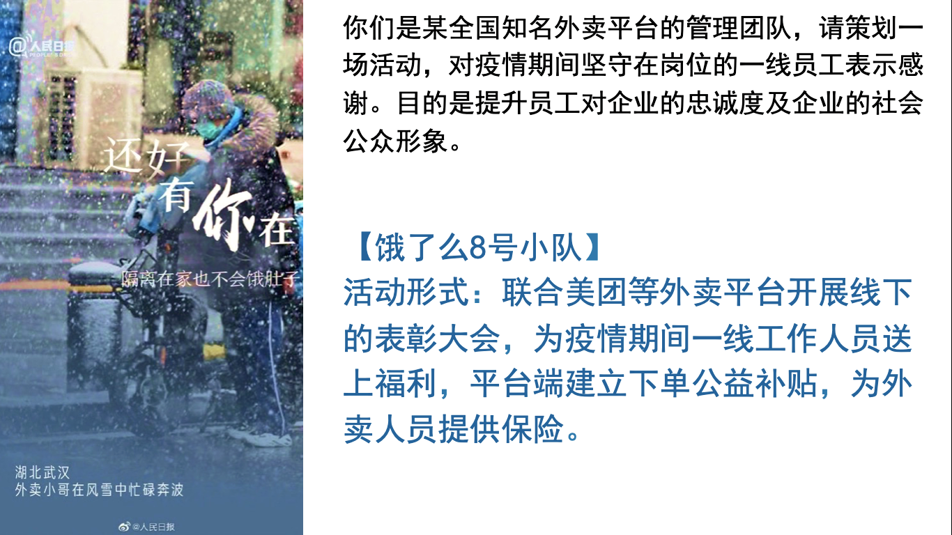 这些活动主题都由同学们自发讨论得出,其中不乏创新思维与家国情怀的体现。特别是19文秘接本班第八小组的同学们提出“为外卖送餐员设立公益性质的保险基金”的想法,并为此设计了一场新闻发布会,让人十分感动。