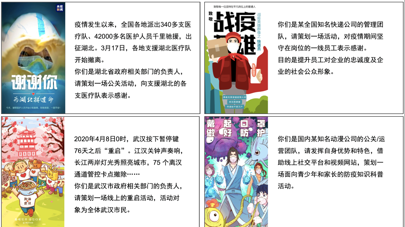 按照既往规划,教师会指导学生分组设计公关策划方案,并鼓励学生走出校园参与到真实的实践活动中去。由于疫情原因,学生无法返校,公关活动方案也无法付诸实践。因此,任课教师调整思路,以“疫情期间的爱心与奉献”为背景,设置了10项公关策划任务,将视角从同学们熟悉的校园转向更为宏大的社会、国家层面。这些公关策划任务涵盖疫情期间的政府形象塑造、企业公共关系维护、爱心公益活动、防疫知识科普等多个领域。