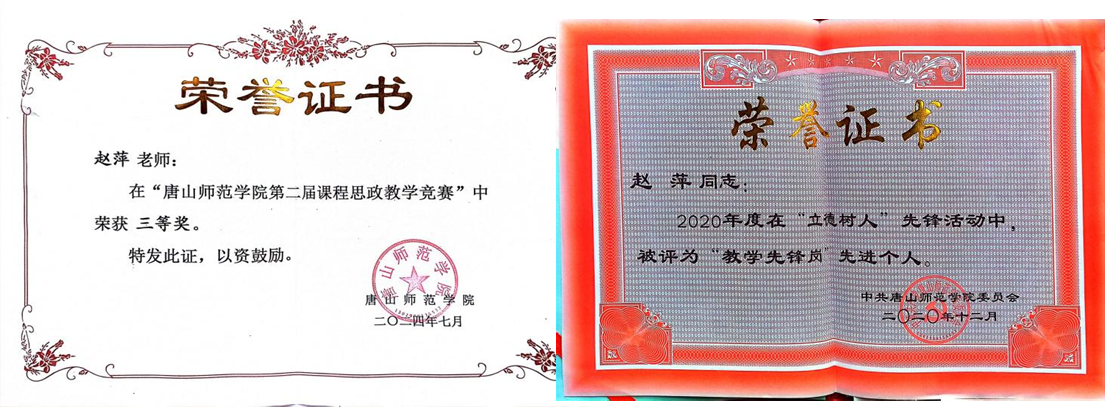 在教学工作中,赵萍老师担任语文课程标准解读、语文教材研究与教学设计、班级管理等多门课程的讲授,主讲课程“班级管理”获得“唐山师范学院课程思政示范课程”,参加唐山师范学院第十一届教师教学大赛获得一等奖,如图。