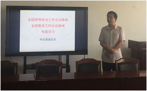 2018年9月11日,中文系组织全体教师政治学习。系党总支书记张学鹏为全体教师传达了全国思想政治工作会议精神和全国教育工作会议精神,要求全体教师坚持社会主义办学方向,提高师德修养,提高师范素质,教书育人,培养德智体美劳全面发展的社会主义建设者和接班人。