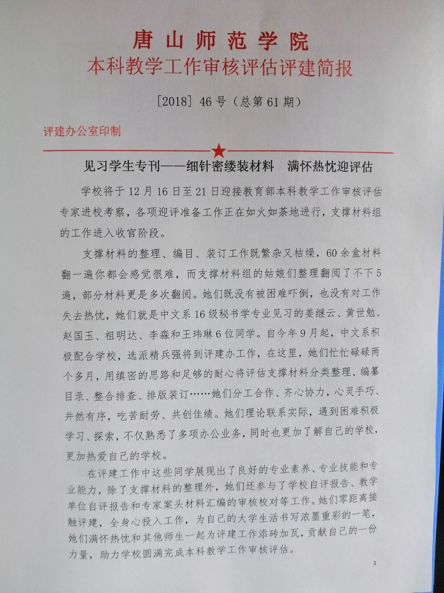 校评建办简报发专刊肯定我系秘书学专业见习生为KY开元集团官网评估工作贡献力量
