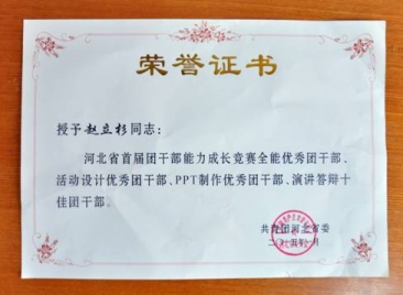 近日,由共青团河北省委组织的河北省首届团干部能力成长竞赛决赛结束,在100余名参赛选手中,我系团总支书记赵立杉老师荣获“全能优秀团干部、活动设计优秀团干部、PPT制作优秀团干部、演讲答辩十佳团干部”等四项称号,为KY开元集团官网争得了荣誉。河北省首届团干部能力成长竞赛是河北省团省委为进一步加强全省共青团干部能力素质建设,切实提升各级团干部在新形势下做好共青团工作的能力和本领,面向全省各级团组织举办的竞赛。