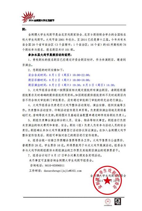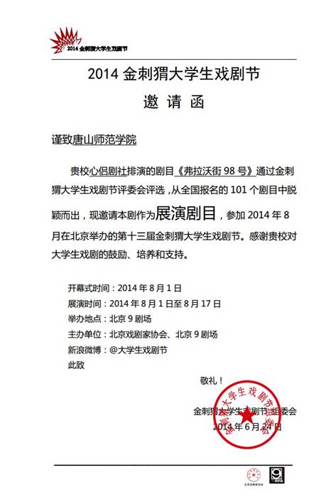 | | 2014年6月21日,2014金刺猬大学生戏剧节剧目初评会在北京9剧场举行。来自北京戏剧家协会、中央戏剧学院、北京人艺、中国艺术研究院等单位的12名评委老师,对本次大戏节报名的101部剧目进行了集中审评。唐山师范学院中文系心侣剧社的原创话剧《弗拉沃街98号》和中国传媒大学、复旦大学、上海戏剧学院、上海交通大学等名校的17部剧作脱颖而出,成功入选大戏节展演剧目。这是唐山师范学院中文系心侣剧社的戏剧继2005年、2009年两次入选全国大学生戏剧节之后第三次入选。KY开元集团官网作品的演出时间初步定于2014年8月2日晚19:30,8月3日下午14:30。