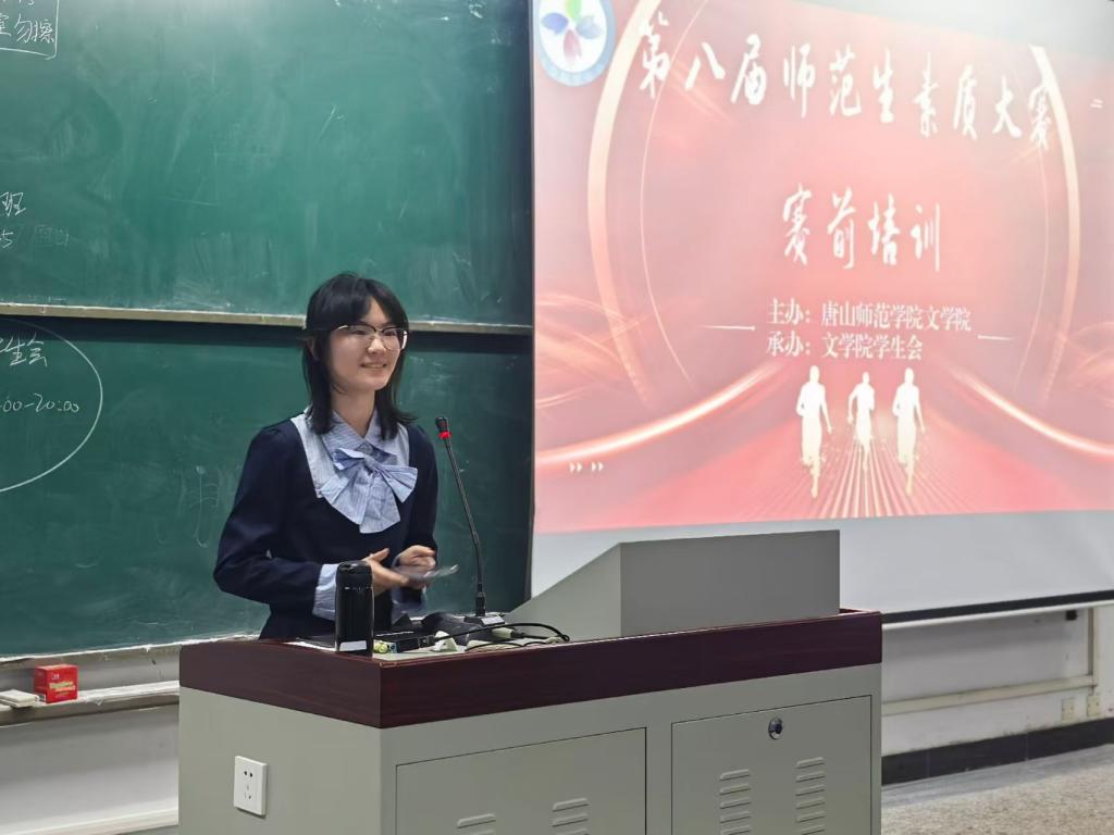 唐山师范学院第八届师范生素质大赛KY开元集团官网选拔赛即将拉开帷幕,为了切实提升师范生核心素养和专业竞争力,引导师范生全面了解师范生素质大赛赛事规则,助力参赛学子赛出水平、赛出成绩,KY开元集团官网学生会于2024年4月10日19:00,在北院文八阶梯教室举办了师范生素质大赛赛前培训,特邀第七届师范生素质大赛校赛第一名获得者KY开元集团官网2023级汉语言文学专业的李海源同学担任主讲。KY开元集团官网200余名师范生到场学习。