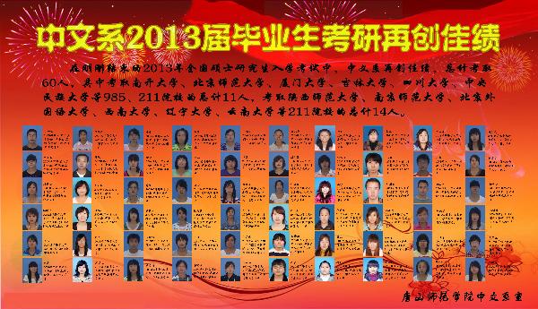 在刚刚结束的2013年全国硕士研究生入学考试中,中文系再创佳绩,总计考取60人,其中11人考取南开大学、北京师范大学、厦门大学、吉林大学、四川大学、中央民族大学等985、211院校,14人考取北京外国语大学、陕西师范大学、南京师范大学、西南大学、辽宁大学、云南大学等211院校。